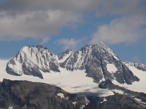 Nun steuern wir das Kals-Matreier-Törl-Haus an. Hier gehts ziemlich stel runter, trotz Serpentinengang wären hiwr Wanderstöcke sehr hilfreich gewesen. Hier haben wir ständig einen Wahnsinnsausblick auf den Glockner und die Glocknerwand – einfach wie sich der Gletscher in der Sonne spiegelt. Unterhalb der Glocknerwand entdecken wir mit dem Fernglas eine Seilschaft, die talwärts unterwegs ist.