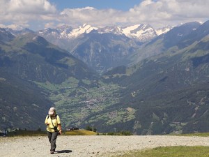 Um 10:30 sind wir startklar mit Wanderbekleidung, Rucksack, Fotoapparate und Fernglas. Wir fahren mit der Goldriedbahn I bergwärts. Oben entscheiden wir uns für die Tour zur Adlerlounge. Die Wanderung ist ständig von Stopps unterbrochen, weil wir die bezaubernde Aussicht in uns aufsaugen müssen. Wir machen viele Fotos- ich bin mir nicht sicher, ob man solche Eindrücke wirklich festhalten kann. Vor der Adlerlounge eine kleine Bewährungsprobe für Gitti – Kühe als Wegelagerer.