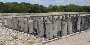 Dann durchschreiten wir das Tor – eine riesige Fläche, wo die ehemaligen Baracken standen – schwarze Steinflächen, die den Grundriss solcher Baracken zeigen. Ein heißer Wind in der drückenden Hitze drückt uns noch zusätzlich. Allein die vage Vorstellung, denn wirklich vorstellen können wir es uns nicht, macht traurig, zornig, wütend und hilflos zugleich.