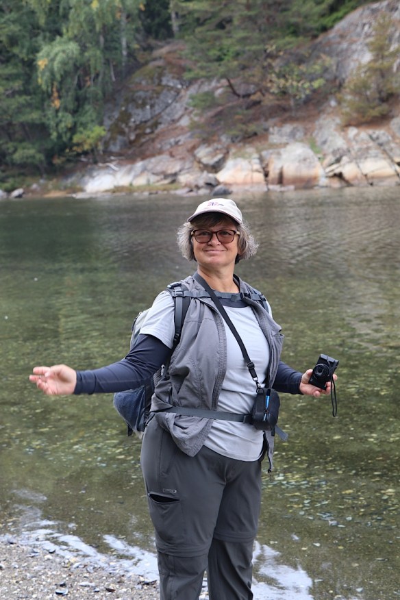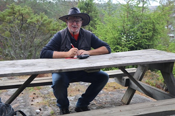 Am nächsten Tag machen wir eine Geocachingwanderung in der näheren Umgebung des Campingplatzes am Ufer des Fjords. Insgesamt machen wir bei dieser Wanderung 14 Caches. Das heisst Eintragungen in das Logbuch, Notizen in den eigenen Aufzeichnungen, damit am Abend das alles richtig geloggt werden kann, usw. Diese Schreibarbeiten und bürokratischen Aufgaben habe ich fast alle am Geburtstag von Gitti zu ihrer Entlastung übernommen. Bei einer dieser Eintragungen werde ich von ihr zum Angestelltentrapper ernannt.