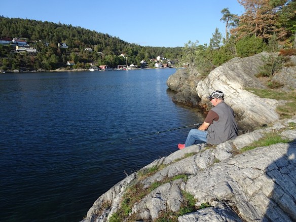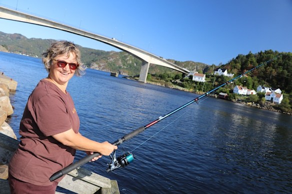 Also sind wir, ausgelaugt von der Wanderung (zumindest für mich traf das zu), mit den Angeln zum Ufer des CP. Rüber zu den Klippen und die Angel ausgeworfen. Nach den ersten Versuchen eindeutig – das Wasser ist zu seicht – wir müssen auf den Bootssteg wechseln. Also raus ans Ende des Bootsstegs. Gitti platziert sich leicht erhöht mit guter Aussicht auf den Fjord und wirft ihr Fischerl raus. Ich gehe auf einen Seitenausleger, der bei jeder Wellenbewegung mitgeht. Auch beim Auswerfen muss ich sehr aufpassen, dass ich nicht im Wasser lande.
