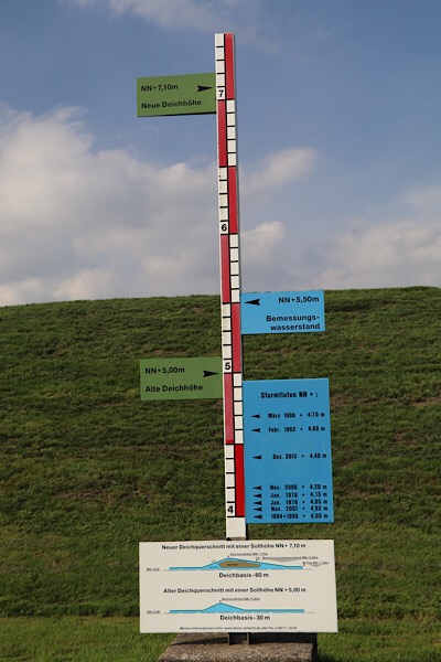 In Dornumersiel (Ostfriesland) haben wir bei Lösung eines Multis (GC2HZ3A) ebenfalls eine Hinweistafeln mit den Jahreszahlen der stärksten Sturmfluten gefunden. Hier wurde durch die Orkanflut von 1962 die Deichlinie weiter nach vorne verlegt, was zur Schließung des alten Hafens Westaccumersiel führte. Heute konnten wir Ausbesserungsarbeiten an den Deichanlagen zwischen Dornumersiel und Neßmersiel beobachten.