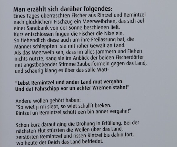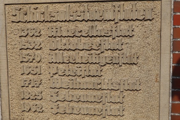 Überall an der Küste, besonders in den Orten, die von über 7m hohen Deichen geschützt werden, treffen wir auf Hinweise katastrophaler Sturmfluten. Bei der Fahrt in Wremen lesen wir neben einem Gedenkstein auf einer Info-Tafel folgende Geschichte: