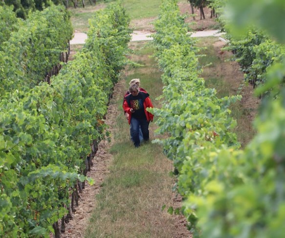 Heute wird diese ehemalige Küste für intensiven Weinbau genutzt. An den angeschnittenen Trauben sehen wir, dass die Lese voll im Gange ist. Wir treffen auf Weinwandergruppen, die die Bewegung in der Natur mit einer Kostprobe des hier angebauten Weins nutzen.