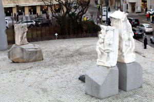 Von der Brüstung der Albertina sehen wir die Stelle des ehemaligen Philliphof, wo im März 1945 bei einem Bombenangriff Hunderte Menschen ihr Leben verloren. Heute befindet sich das Mahnmal gegen Krieg und Faschismus, das Alfred Hrdlicka 1988 hier geschaffen hat.