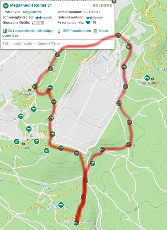 Nun zweigten wir von der Megaknecht Runde ab. Die Burgruine Scharfeneck war unser Ziel. Zwar mussten wir einige Höhenmeter absolvieren, aber zwei Caches warteten auf uns. In der Wüste ca. am halben Weg zur Ruine wurden wir das erstemal fündig. Im Listing wird vor den Wildschweinen gewarnt und man soll deshalb nichts stark riechendes aussetzen. Wir fanden zwei Gäste – Günther der Schreckliche aus Nordrhein-Westfalen und Travel Unicorn Geocoin -, die wir gegen zwei neue Gäste austauschten. Nun warten zwei neue Einwohner auf Besuch – Liver Bird, der nach Liverpool will und Kürbiskernöl – das grüne Gold. Nun gings weiter schnaufend und etwas pfauchend – typische Städter, die noch dazu heute viel zu warm angezogen waren zur Ruine auf den