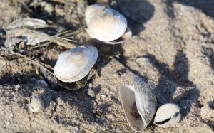 Wir spazieren am Strand am Wattmeer entlang. Die Ebbe bietet eine weite Ausicht auf den wellenförmigen Schlickboden. Im silbrig glänzenden Boden blinken die weißen Muschelschalen wie große Perlen im strahlendem Sonnenschein. Allerdings jetzt im Februar zeigt der kühle Wind allerdings immer noch seine kalten Zähne allerdings wesentlich zahmer als die letzten Tage. Beim Schlendern am Strand zu unserem ersten Cache an diesem beobachten wir allerlei vier-und zweibeinige Strandläufer mit unterschiedlichster „Bereifung“ Gummi- und Lackstiefel alles trifft man hier.