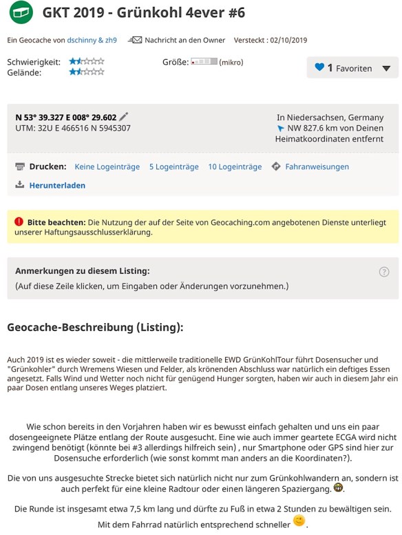 eingewiesen und dass es bei dieser Wanderung sehr „gesittet“ zugeht und eigentlich harmlos ist. Während ich diesen Artikel schreibe, werde ich über die ersten Logs meiner TBs per Mail informiert. Beim abschließenden Grünkohlessen wurden wir in die Geheimnisse der Küche des Wurster Landkreises eingeweiht. Deftiger, schmackhafter Grünkohl mit Pinkel, Würsten und Fleisch. Dazu Salz- oder Bratkartoffeln und Senf. Für uns ein toller Nachmittag – ein großes Dankeschön an all jene, die zum Gelingen des Events beigetragen haben.