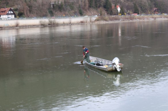 Sie hätte sich auch einen Cache verdient. Dem Donauufer weiter folgend kommen wir zum Drei Flüsse Eck (GC21781) von „Trudies“ mit 465 Favoritenpunkten für die grandiose Aussicht. Passau ist weltweit der einzige Ort, wo drei Flüsse aus unterschiedlichen Himmelsrichtungen zusammen fließen und in einer anderen Richtung weiter fließen. Wir beobachten hier einen Flussfischer beim Netze auslegen.