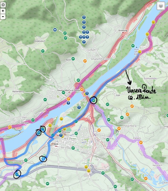 Wir radeln an Melk vorbei und nähern uns einem Wäldchen in den Donauauen in der Wachau, eine 35 km lange Flusslandschaft zwischen Melk und Krems an der Donau. Die Donau schneidet sich hier durch die Südspitze der Böhmischen Masse. Die Wachau ist bekannt auch für seine Marillenbäume und den trockenen Weißwein, den Grünen Veltliner oder Riesling. Bevor wir unser der Natur näher widmen suchen wir den Cache Waldwegerl – GC7381R von BLIE1, wo wir uns um 12:47 eintragen. Die nächste Station ist die Wasserversorgungsanlage Melk – GC7DTTM von BLIE1 um 12:57. Der Owner schreibt in seinem Listing, dass die Melker Wasserwerke zwei Brunnen, drei Hochbehälter, zwei Drucksteigerungsanlagen und 50 km Wasserleitungen zur Versorgung von 1550 Hausanschlüssen und 200 Hydranten benötigen.