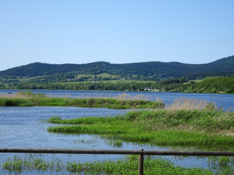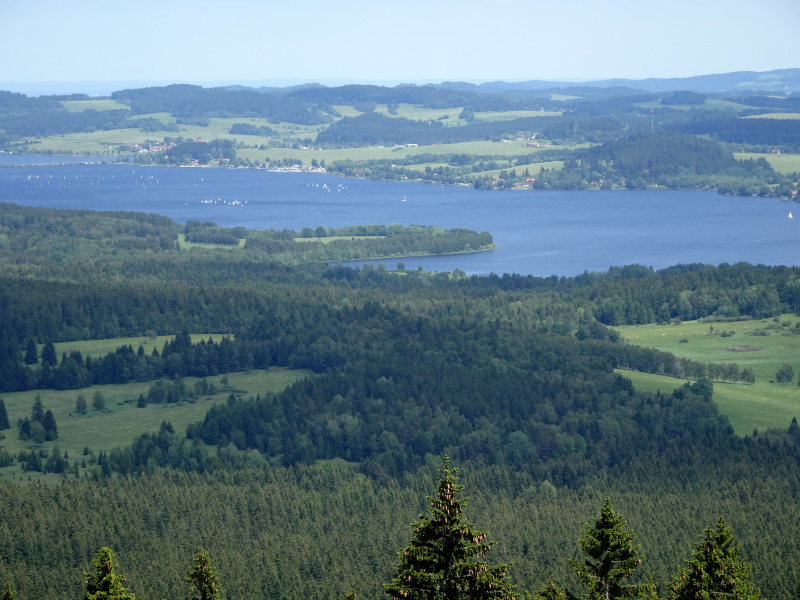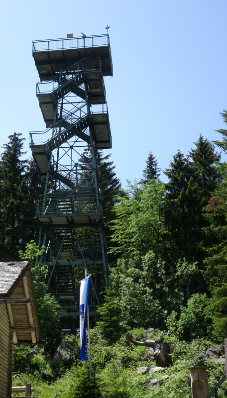 Wir erreichen den Aussichtsturm nach einer kurzen Wanderung von ca. 2 km bei (48°42′10.09″N 13°58′16.84″E). Der ehemalige Ölbohrturm aus Gänserndorf, errichtet 1967, bietet mit seiner Höhe von 24m, die über 137 Stufen erreicht werden kann, einen herrlichen Überblick über den Böhmerwald und den Stausee Lipno. Am Rückweg zeigt uns ein junger Vater in festlicher Kleidung, wie man einen Kinderwagen sportlich am Forstweg durch den Wald schiebt.