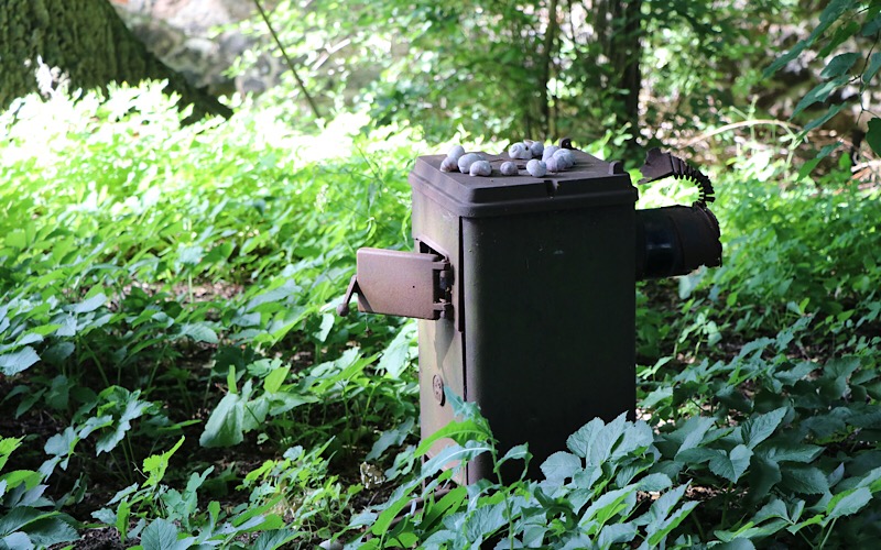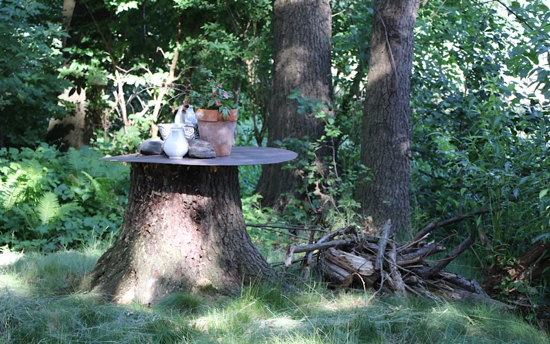 Während dem genussvollen Essen werden unsere Blicke immer wieder abgelenkt von einzelnen Utensilien einer vergangenen Zeit. Da ein rostiger, gusseisener, alter Ofen mitten im Blätterwald und oben sind alte Schneckenhäuser wie riesige weiße Perlen drapiert. Dann sehen wir altes, weisses Kaffeeporzellan, das auf alten Mauern steht und für einen interessanten Kontrapunkt in diesem Dickicht aus Grün sorgt. Wir sitzen so gebannt und enntspannt da, hängen zeitweise unseren Gedanken nach, und plötzlich spüre ich den Flügelschlag einer Amsel oder Star, die so knappt an mir vorbeifliegt und mich aus meinen Gedanken reisst.