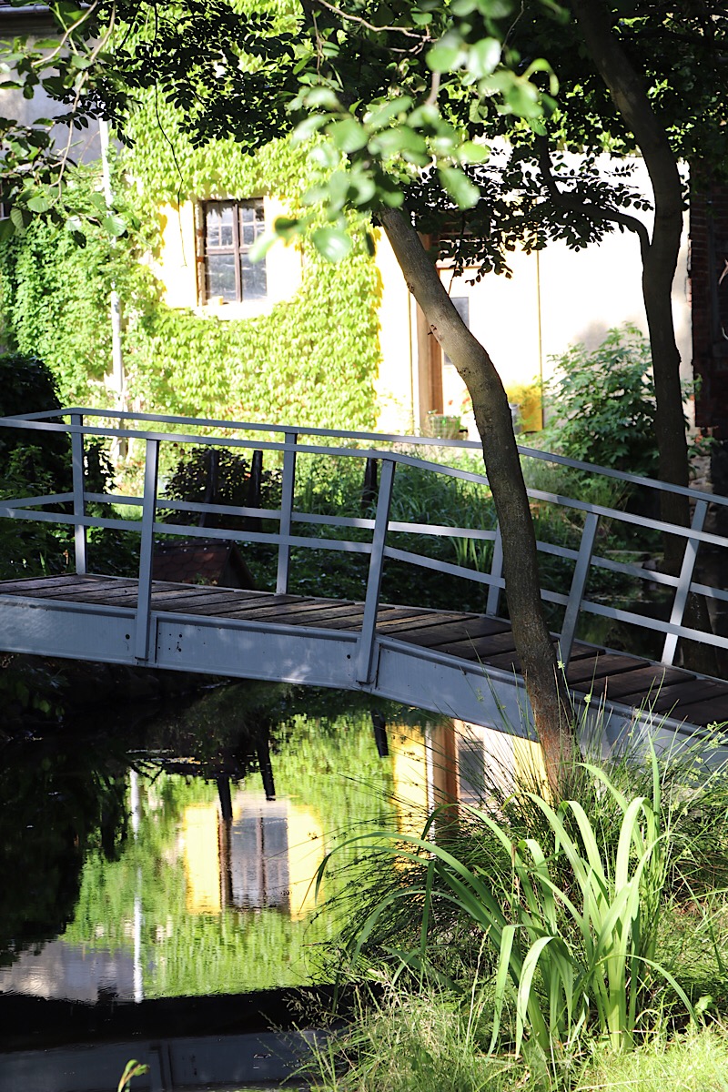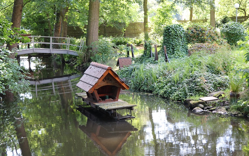 Ich schnappe mir meine Kamera und versuche diese Eindrücke bei einer kleinen Fototour festzuhalten. Dabei stosse ich auf weitere Geheimnisse des Parks. Ein kleines Häuschen, das im Wasserkanal der Mühle platziert ist, eine Feuerstelle für laue Sommerabende zum Grillen, diverse wild wuchernde Pflanzen mit großen Blättern bereit jedes spärliche Licht, das durch den Blätterwald dringt aufzusaugen. Begleitet wird dieser Rundgang vom ständigen Gezwitscher und Zirpen der Singvögel. Und da noch eine kleine Hütte, deren Geheimnis ich nicht lüfte.