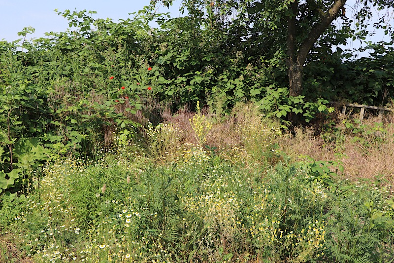 Hier in dieser Parkanlage gibt es mehrere Insektenhotels und eine naturbelassene Blumenwiese für die Bienen der Imkerei des Nachbarn. In einer anderen Ecke entdecke ich Kamillenpflanzen deren Duft man bereits ab 2 Meter Entfernung riecht.
