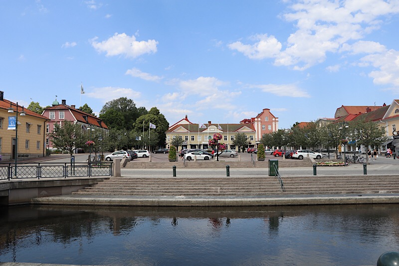 Lasse fährt uns durch die Vorstadtviertel der Stadt. Wir überqueren den Fluß Säveån und genehmigen uns am Lilla Torget, wo sich angrenzend das Alingsås Museum befindet, ein Eis. Heute ist es auch für schwedische Verhältnisse sehr warm.
