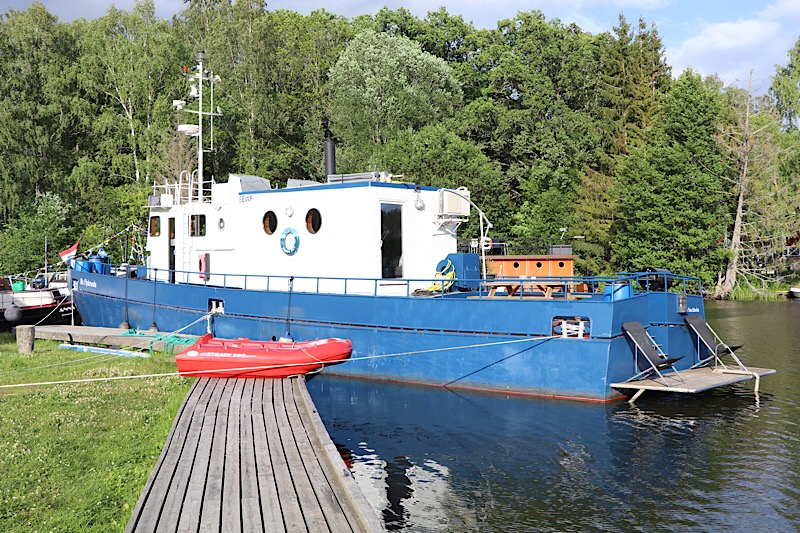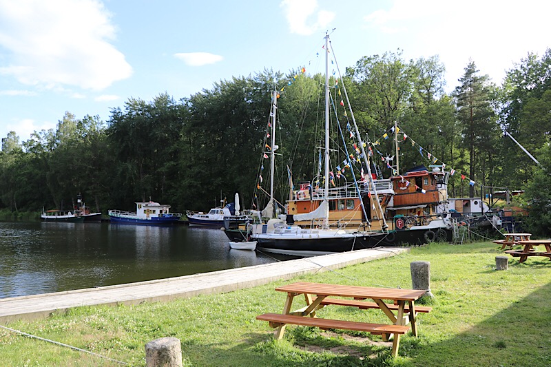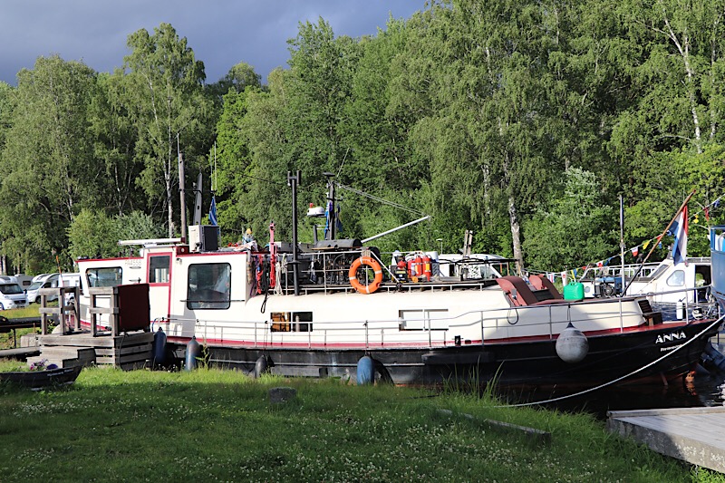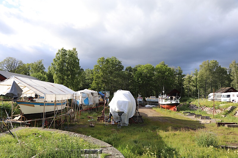 Als wir am Kanal ankamen wurde im Trockendock an mehreren Schiffen geschliffen, gemalt und gehämmert. Die ältere Booten wurden umfangreichen Restaurierungsarbeiten unterzogen. Der Stellplatz ist ein Insidertipp unter Womo-FahrerInnen sein. Wir konnten uns mit Blick auf den Kanal noch gut positionieren. Bis zum Abend wurde es für andere schon eng und manche Kabel mussten umgelegt werden. Wir hatten direkt oberhalb des Womos Tisch und Bänke und verspeisten unseren Griechischen Salat mit sonniger Aussicht auf einen Schwedischen Kanal.