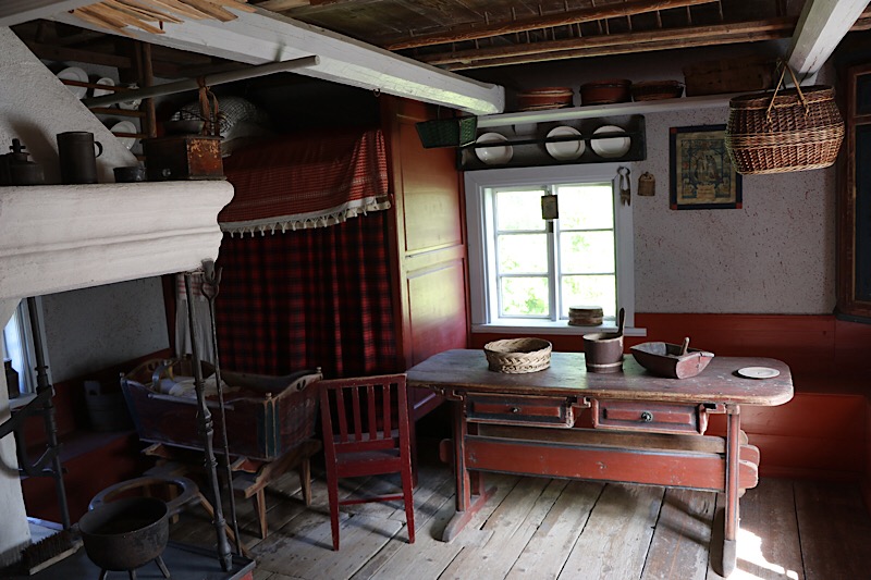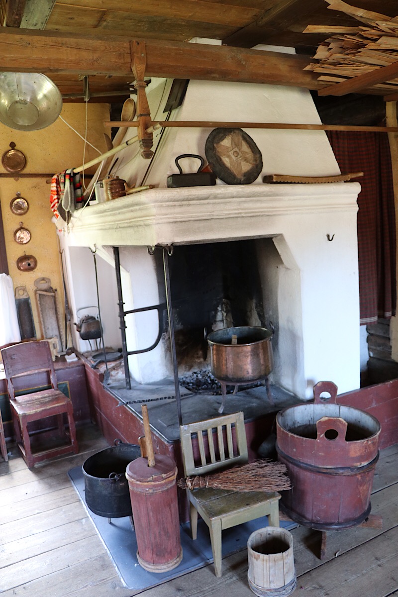 Wir stehen vor diesem Plan und entscheiden uns für einen Rundgang im Museumsdorf. Am Eingang bezahlen wir für uns Beide € 18.- mit Kreditkarte, weil Bargeld meistens gar nicht erwartet wird. Wir tauchen ein in eine Welt, wo Grundbesitz eine Voraussetzung für besseres Leben und Wohlstand war. Die Bauern hatte bessere Wohnbedingungen, wärmere und bessere ausgestattete Zimmer. Die anderen mussten sich als Knechte, Mägde und Tagelöhner irgentwie durchkämpfen. Es gab einzelne Berufsgruppen wie Schmied, Tischler oder Postbeamte, die wegen ihrer beruflichen Position ein etwas besseres Leben als die Tagelöhner führen konnten.