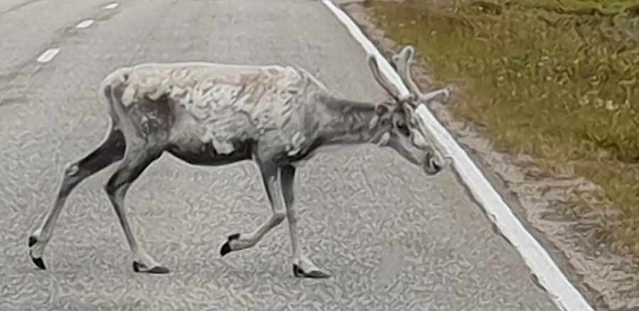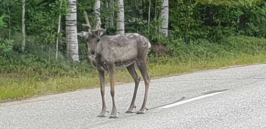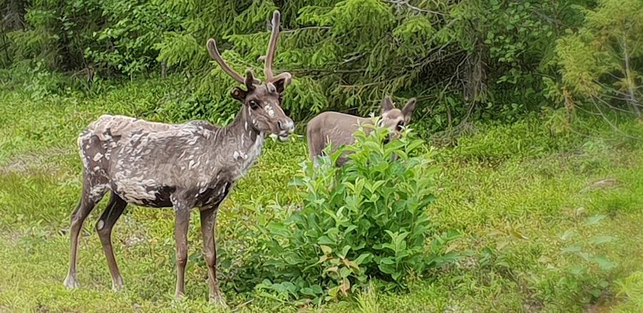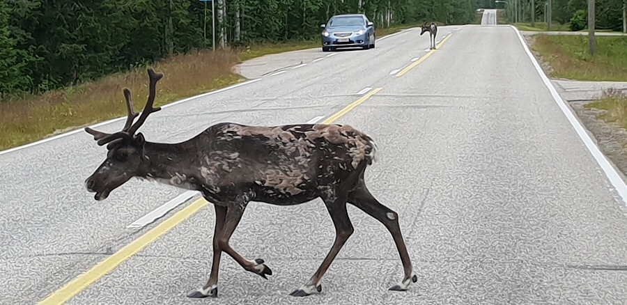 Nach dem Stone Age Center geht es weiter nordwärts in das Rentierzüchtergebiet das beginnende Lappland. Prompt präsentieren sich auch einige Exemplare auf der Fahrt zum Campingplatz.