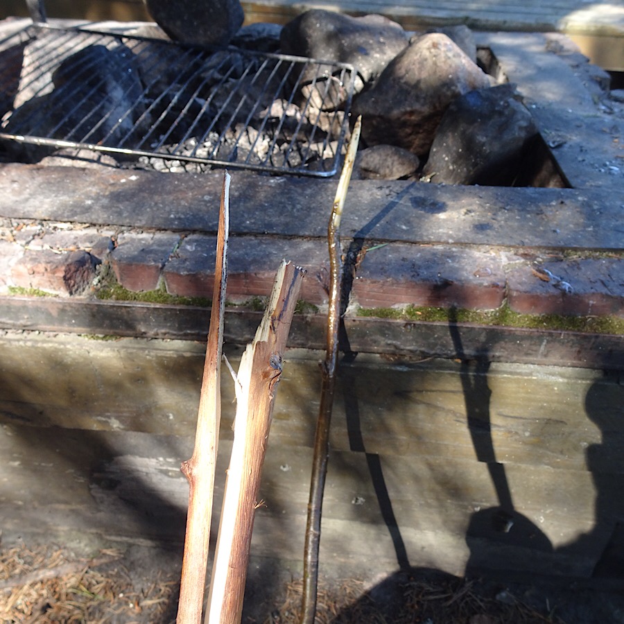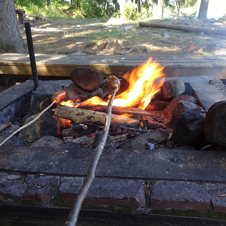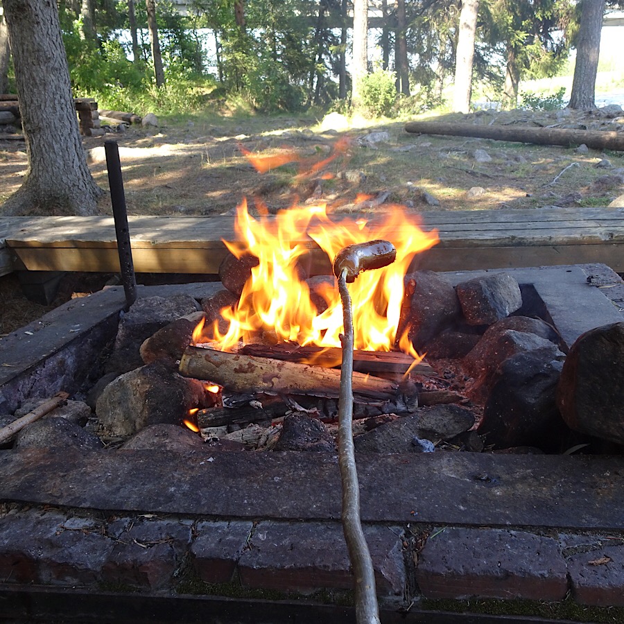 Auf der größeren Insel befindet sich auch eine Grillstelle. Am zweiten Tag starten wir mit Grillwürsten ausgerüstet und statten den FischerInnen einen Besuch ab. Ein älterer Schwede war so nett und hat uns einpaar Holzscheiter zugehackt. Es war frisches Fichtenholz mit sehr intensiven Geruch des Holzes. Es gibt so etwas wie ausgleichende Gerechtigkeit, er war der einzige, der ein Fisch an Land ziehen konnte.