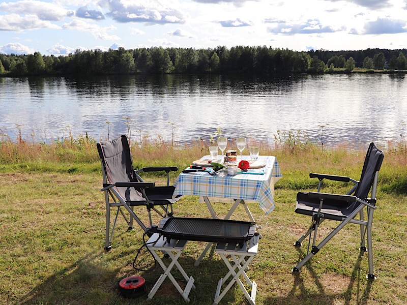 Es gehört sicher zu den schönen Momenten im Leben bei Sonnenschein in Lappland an einem Fluss zum Grillen beim Abendessen ein Gläschen Wein zu trinken. Neben dem Genuss des Essens und Trinken Kommen die Eindrücke der Natur dazu, die quasi als Beilage das abendliche Schmausen garnieren.