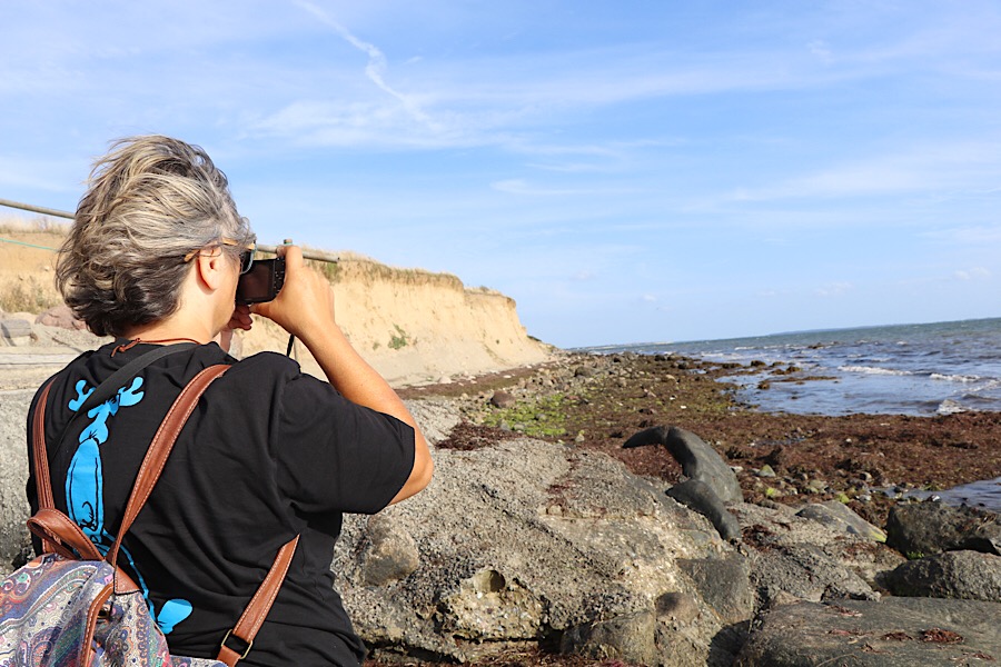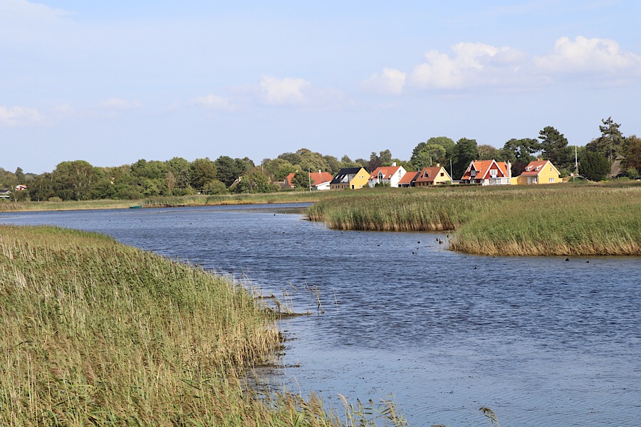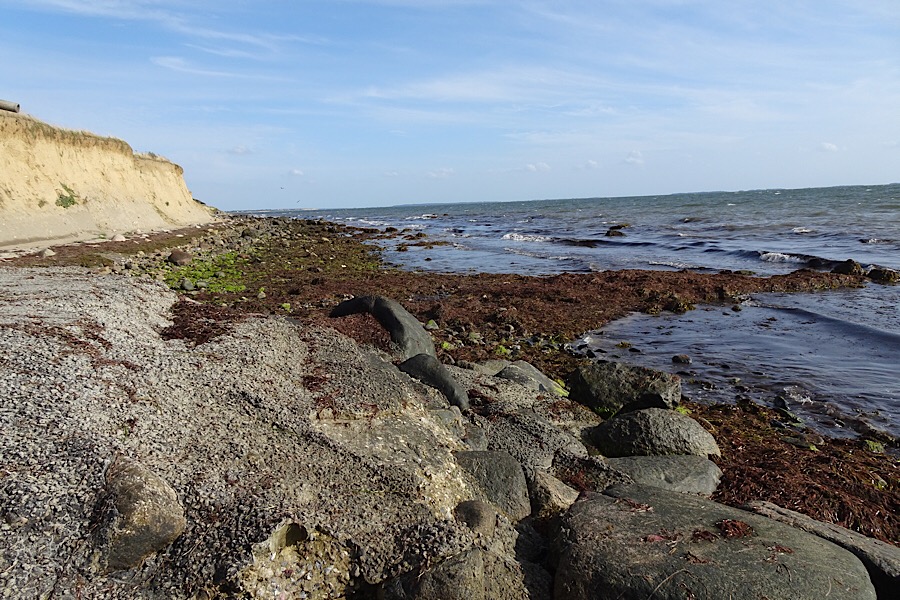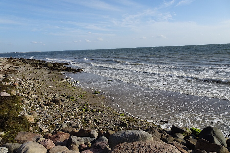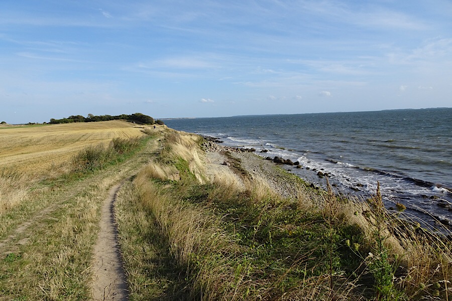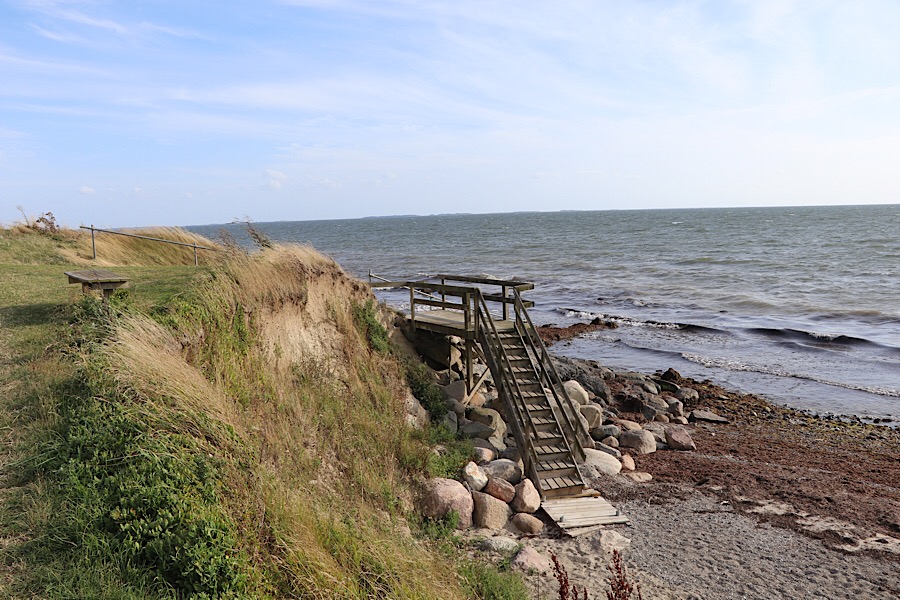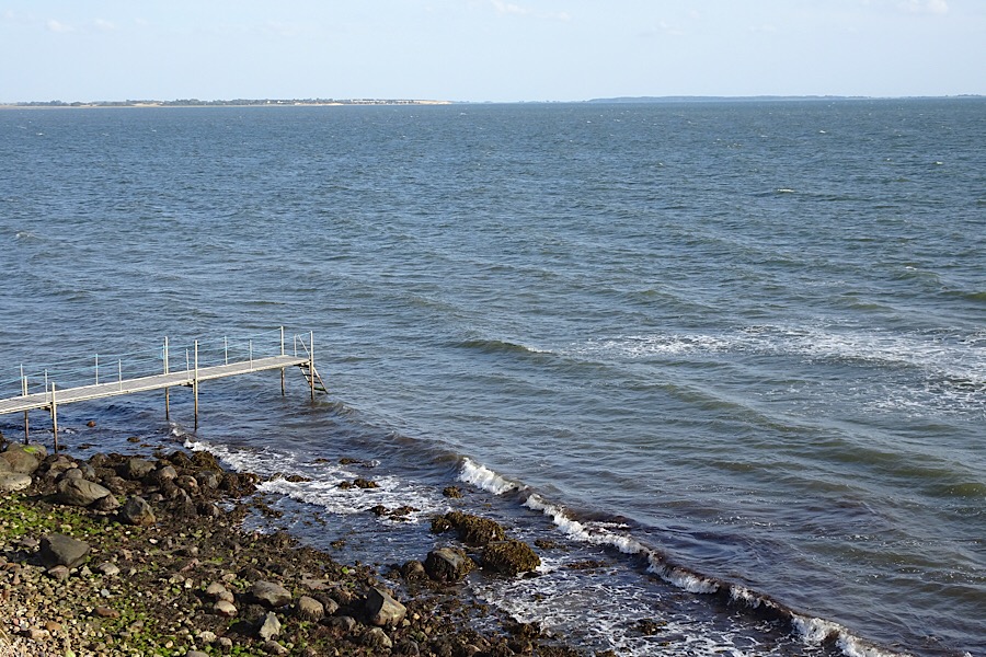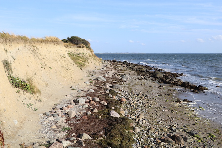 Nach einer stürmischen Nacht in Bua, wo unsere Fahrradabdeckung vom Sturm endgültig zerfleddert wurde landen wir am Weg zu Uschi und Willi, die wir in Dänemark treffen wollen, in Enó by am Womo-Stellplatz des hiesigen Segelclubs. Zwischen deutschen und dänischen CamperInnen fanden wir noch einen Platz. Wir hatten Aussicht auf den Segelhafen bei wieder strahlend blauen Himmel. Nach der Anmeldung beim Hafenmeister starten wir eine mehr zweistündige Geocaching – Tour entlang des Enø Klintegården mit tollen Ausblicken auf die Meeresbucht.