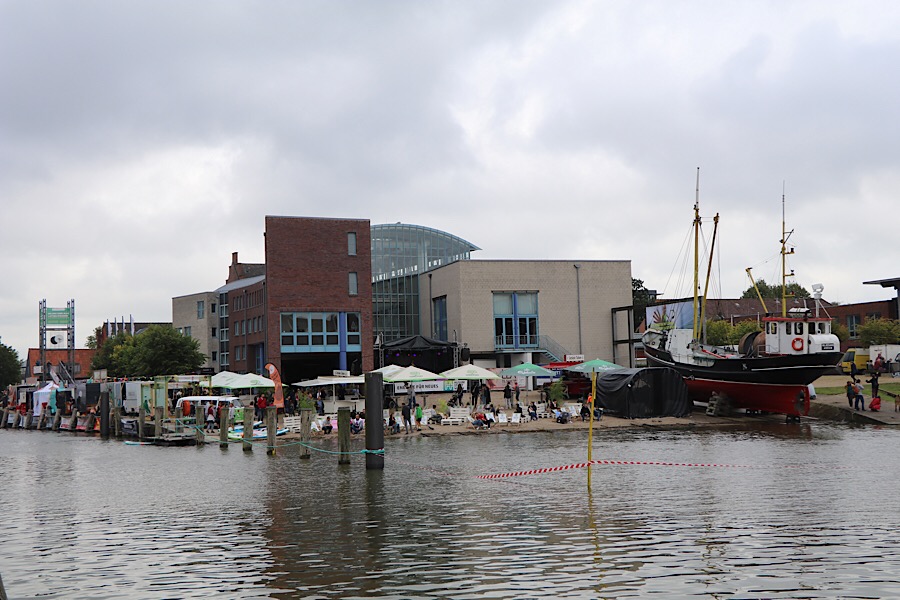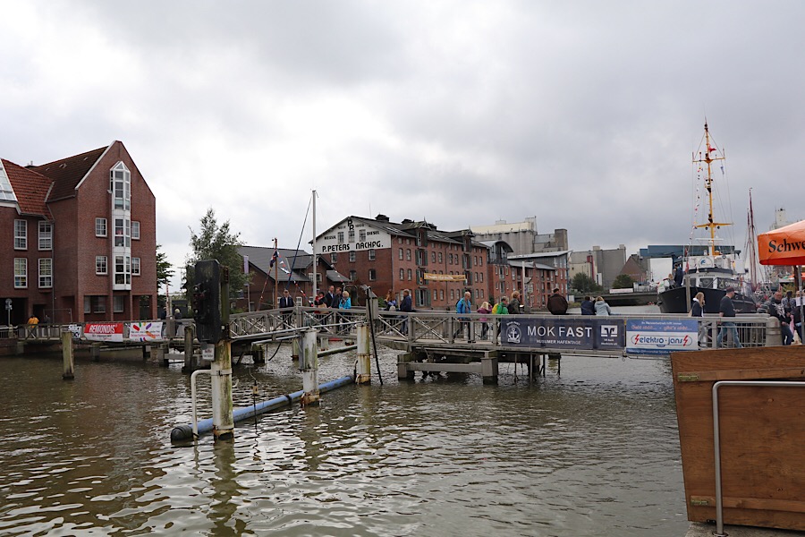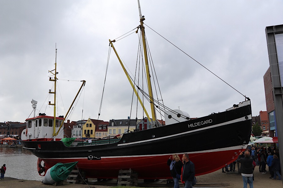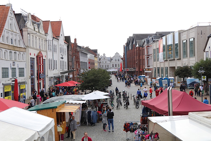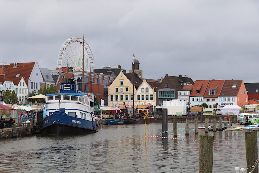 In Ribe regnet es in Strömen also beschließen wir etwas mehr als 100 km südwärts zu fahren. Auf der Strasse Nr. 11 erreichen wir die dänisch – deutsche Grenze und nach einer Kaffeepause erreichen wir Husum. Die Zufahrt zum Campingplatz führt am Hafen vorbei und wir merken, dass hier ein Fest stattfindet. Wir sind mitten in den Husumer Hafentagen gelandet. Der Regen wird zu einem spontanen Nieseln und mit den Rädern starten wir zu viert ins Hafenfest.