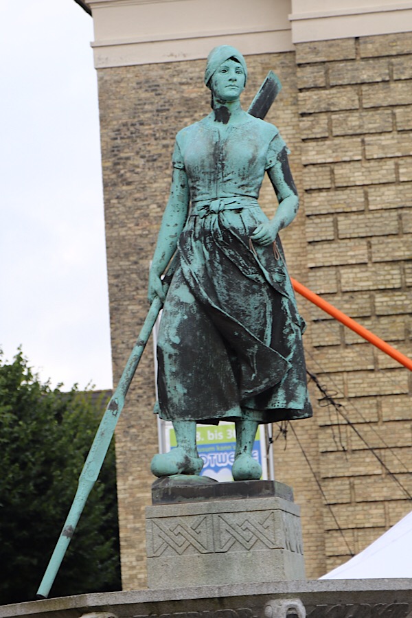 Brunnenfigur „Tine“ des Asmussen-Woldsen-Denkmals auf dem Husumer Marktplatz. Im Jahre 1859 gründeten die vermögende Husumerin Anna Catharina Asmussen (1793–1868) und ihr Cousin, der Großkaufmann und Schiffsreeder August Friedrich Woldsen (1792–1866) – die Stiftung „Asmussen-Woldsen-Vermächtnis für die Stadt Husum“. Noch heute gehören etliche Ländereien, der Rote Haubarg bei Simonsberg und der Asmussen-Woldsen-Kindergarten zum Stiftungsumfang.