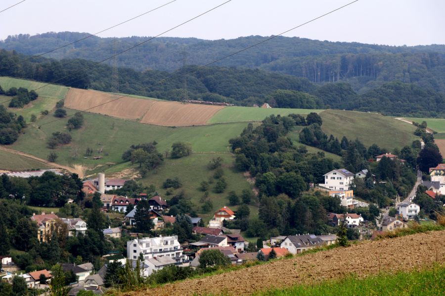 Nach 10 Poppenwald – und der Berg – GC7BK3P machte ich einen Sidestep zu einem Kurzmulti von musikierling – Plöcking – GC6DNFN – das im Listing angekündigte Marterl und Bankerl lag ideal im Schatten. Eine gute Gelegenheit dem eigenen Körper Wasser nach zu tanken. Ob der Güterweg wunderschön ist, sei dahin gestellt. Jedenfalls gab es bald die versprochene Aussicht auf Maria Gugging. Zum 11 Poppenwald – gleich – GC7BK3V suchte ich zuerst einen Weg im Wald. Als die Brombeersträucher immer dichter wurden, marschierte ich dann doch am Waldrand talwärts.