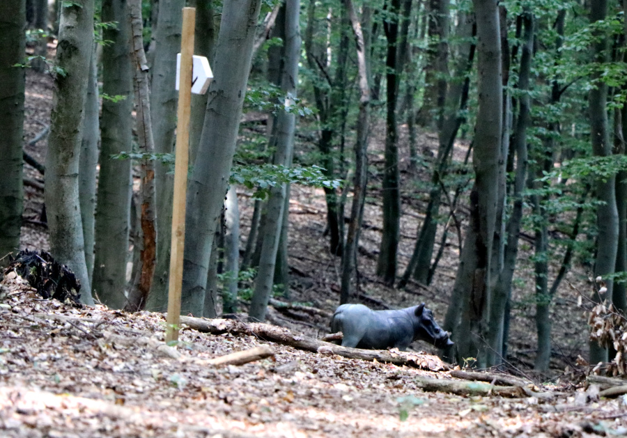 Hier an der Gabelung zu Nummer 08 Poppenwald rund&xund – GC7BK37 traf ich auf die einzigen WanderInnen, die ich während der Tour zu Gesicht bekam. Zwei Frauen marschierten abwärts und ich wartete einige Zeit bis ich in Ruhe die Nr. 07 suchen und loggen konnte. Ich suchte auch bereits nach dem Namen. Eine „Eva“ fand ich bald, aber ihr konnte ich keine Farbe zuordnen. Nach dem ich fündig wurde, nutze ich einen Baumstamm für eine Pause und eine kleine Rechenarbeit für den Bonus. Bei Nummer 8 hinterließ ich auch einen Gast, den ich aus Skandinavien mitbrachte.