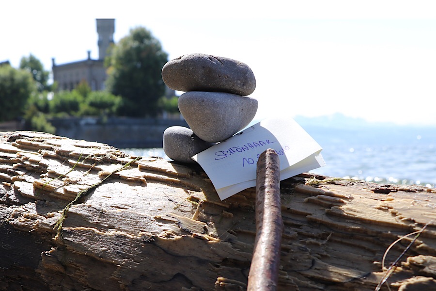 Donna Makrella und ich (Schönhaar) geisterten zuerst mit unseren Rädern mehrmals über die Stufen bis wir einen Platz mit Bodenseekieselsteine zum Auftürmen fanden. Irgendwie eine fast logische Folge der Steinzeit App jetzt mit Steinen etwas zu bauen. Mich hat es an das Steinschmuckbasteln im Stone-Age-Center in Finnland erinnert.