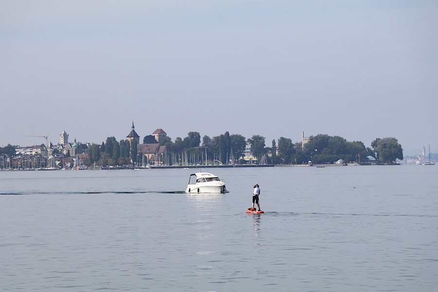 Gemütliches Frühstück mit Ham & Eggs bei Sonnenschein im Freien. Bereits um 10 Uhr an die 20°C Mitte September. Um 10 Uhr 45 fahren wir ab und durchqueren Konstanz für heuer ein letztes Mal.