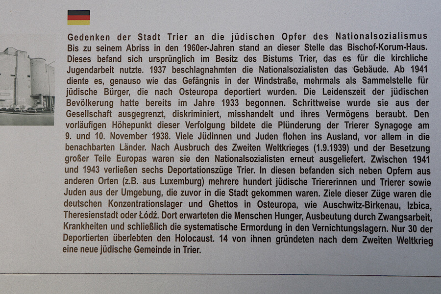 102 jüdische Männer, Frauen und Kinder saßen am 16. Oktober 1941 im Deportationszug Da 3, der sie von Trier in das Ghetto Litzmannstadt im deutsch besetzten Polen transportierte. Nach Wien und Prag war es der dritte Deportations-Transport Nazi-Deutschlands und der erste aus dem Westen. Weitere 410 jüdische Bürger wurden aus Luxemburg, Wittlich und aus Mosel-, Eifel- und Hunsrückdörfern an diesem Tag in das Ghetto deportiert.