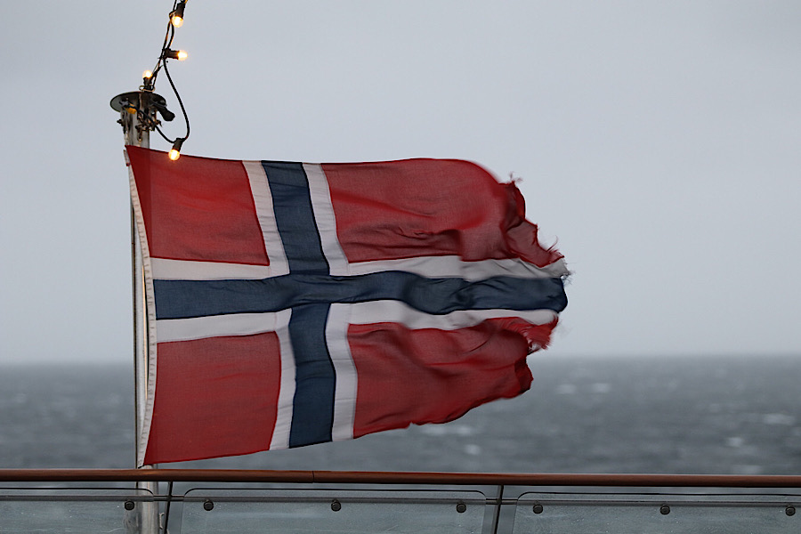 Während der Nachtstunden merkten wir die ersten Auswirkungen des angekündigten Sturmtiefs. Im Halbschlaf wunderte ich mich über die Auf- und Abwärtsbewegung des Bettes. Die Seetauglichkeit habe ich schon öfters bestanden und konnte gemütlich weiter rüsseln, denn der 20-stündige Vortag forderte seinen Tribut. Um 08:30 hüpften wir aus den Federn. Das erste Frühstück an Bord. Wir mussten uns noch bei den angebotenen Köstlichkeiten orientieren. Hering in sechs verschiedenen Soßen, Lachs und Heilbutt nach norwegischer Tradition zubereitet und viele regionale Spezialitäten.