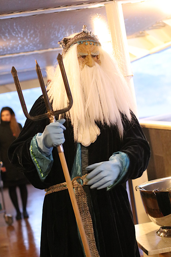 Mit wallenden, weißen Bart, den Dreizack spielerisch, fast herausfordernd, in der Hand, mit dem er Erdbeben auslösen kann, trifft er auf eine Schar AnhängerInnen, die seine Wetterkünste bereits zu spüren bekommen haben. Brigitte stellt sich dem Ritual und lässt sich von der vor kurzem an Bord gekommenen neuen Kapitänin Eiswasser und Eiswürferl in den Nacken schütten. Dafür wird sie mit Schnaps belohnt. Die wildesten Verrenkungen und tollste Mimik im 30-Sekunden-Takt, wo ältere Personen „Turnübungen“ hinlegen, die man ihnen eigentlich gar nicht zugetraut hätte. Wir feiern das Ereignis mit einem Gläschen Sekt.