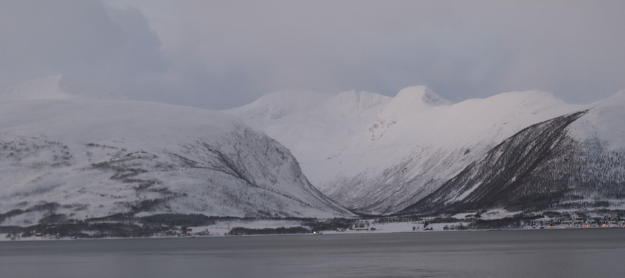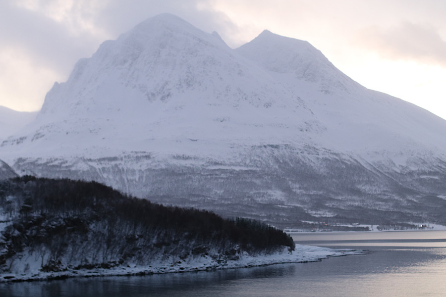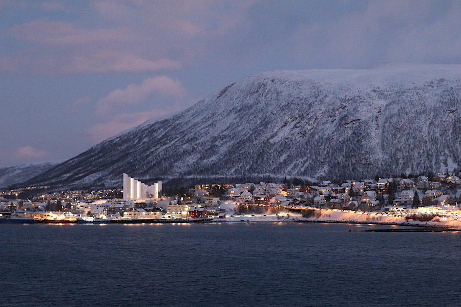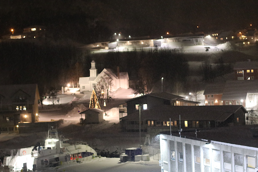 Finnsnes kennen wir nicht von der Hurtigrute, sondern haben wir schon im Sommer besucht als Ausgangspunkt für einen Besuch der Insel Senja. Die Gisund-Brücke, eine der längsten Pfeilerbrücken Europas, mit einer Länge von 1.500 m, die Finnsnes und Senja, der zweitgrößten Insel Norwegens, miteinander verbindet. Kurz nach der Ankunft zieht ein Schneesturm über uns hinweg.