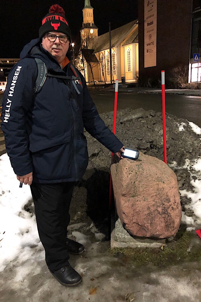 Als erstes hatten wir ein Rendevous mit einem 371 kg schweren Stein. Im GC8920Q – The 371 kg Stone von YNWA 1972 gibt es zu diesem Stein eine Geschichte. Dieser Stein wurde vor ca. 200 Jahren von Eidis Hansen hier von Strand hergetragen. Er setzte ihn einem Beditzer eines Kaufladens bor diec>tür, weil er ihm keinen Alkohol mehr verkaufen wollte. Da es niemand schaffte den Stein vor der Türe zu entfernen wurden Eidis und der Verkäufer sich einig. Eidis trug den Stein weg und bekam dafür etwas Alkohol umsonst.