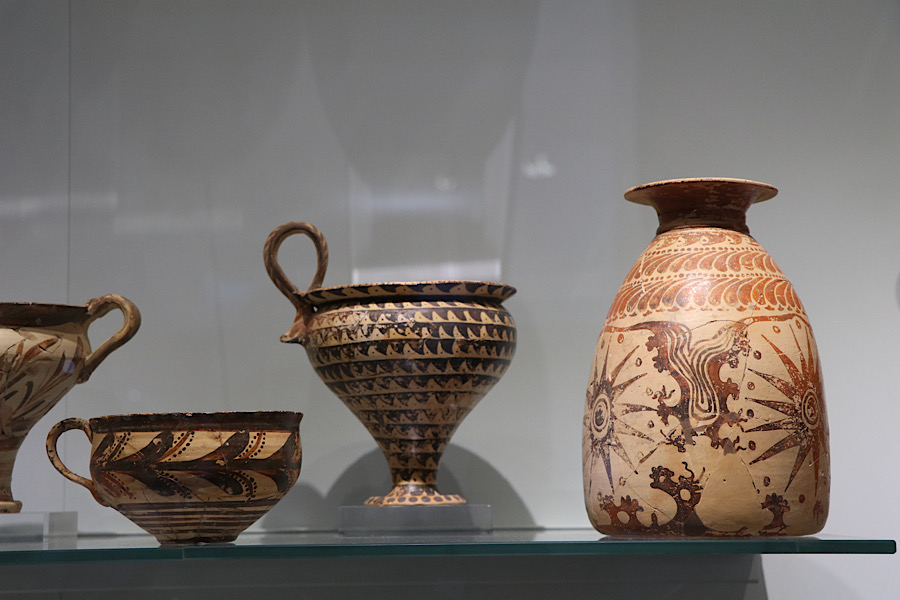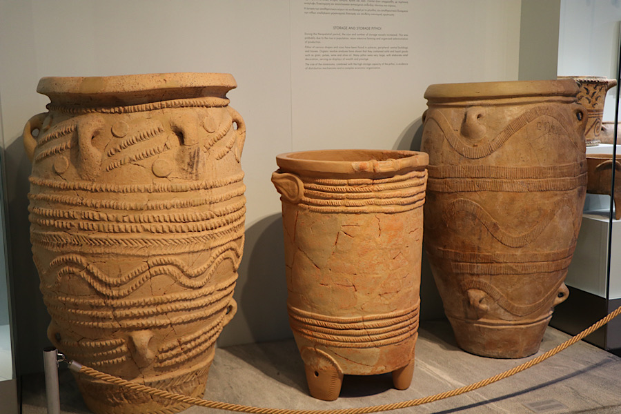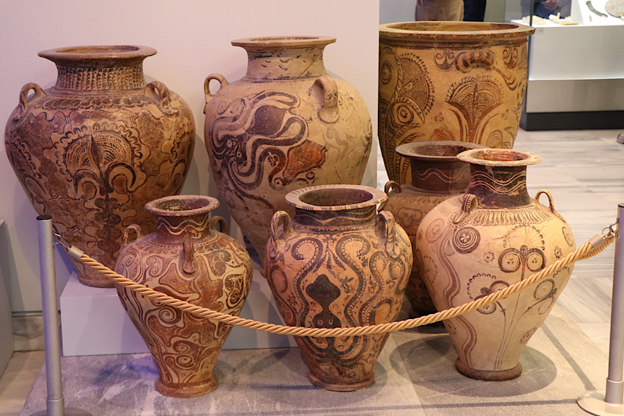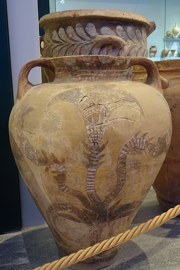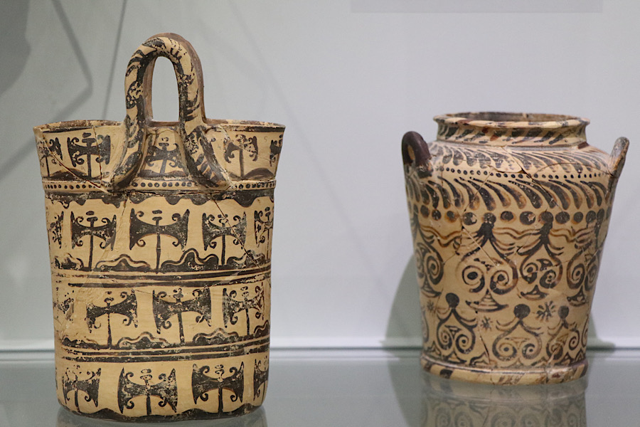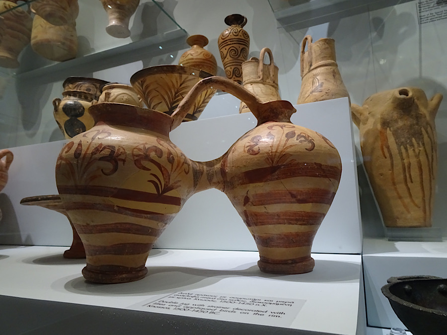 Da gibt es Gefäße mit Tier- und Pflanzenmuster. Bei manchen Amphoren und deren Verwendungszweck kann man auf die Stellung des/der ehemaligen BesitzerIn schließen. Da gibt es klassische Vorratskrüge und Gefäße mit der Doppelaxt, dem Machtsymbol der minoischen HerrsccherInnen.