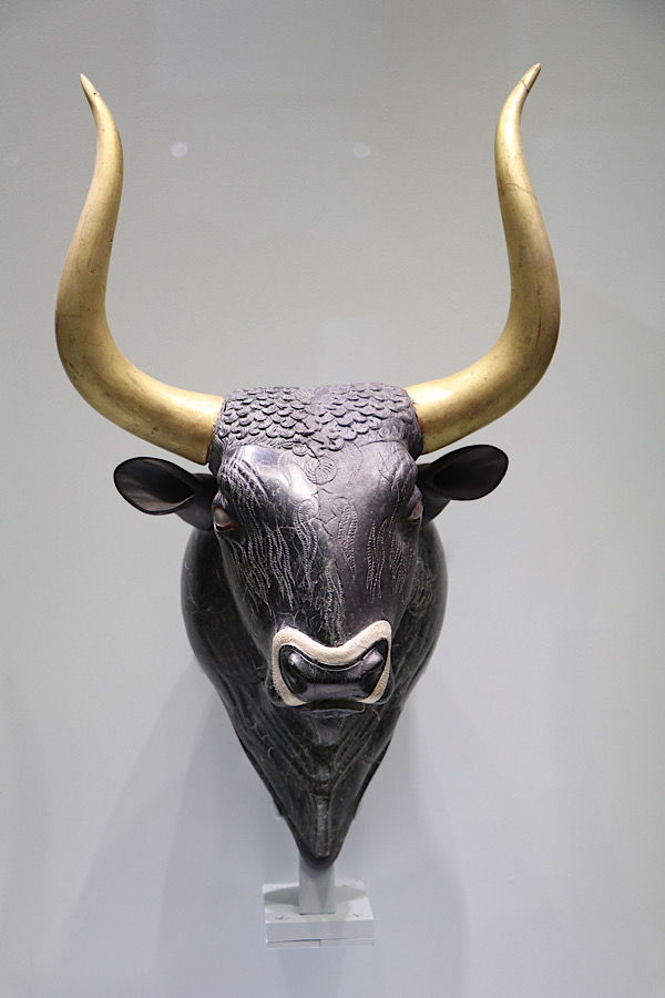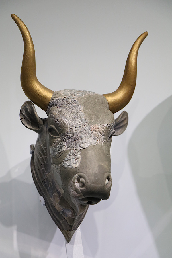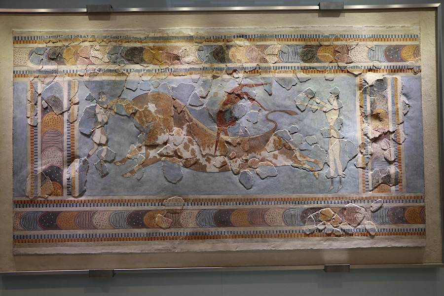 In der griechischen Mythologie wird Kreta mehrfach in Verbindung mit dem Stier gebracht. Bei der Entführung der phönizischen Prinzessin Europa nahm Zeus die Gestalt eines Stiers an. Um sich gegen seine Brüder in der Thronfolge Kretas durchzusetzen, soll Minos den Gott des Meeres, Poseidon, darum gebeten haben, ihm ein Opfertier zu senden. Poseidon sandte ihm einen weißen Stier. Pasiphae, die Gemahlin von Minos, zeugte mit dem kretischen Stier den Minotaurus – ein Ungeheuer, halb Mensch und halb Stier. Die Bedeutung, die der Stier im minoischen Kult gespielt haben muss, zeigt sich allein im Palast von Knossos auf zwanzig Reliefs und neun Fresken.