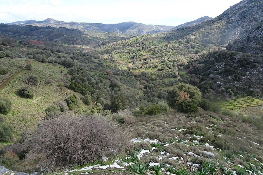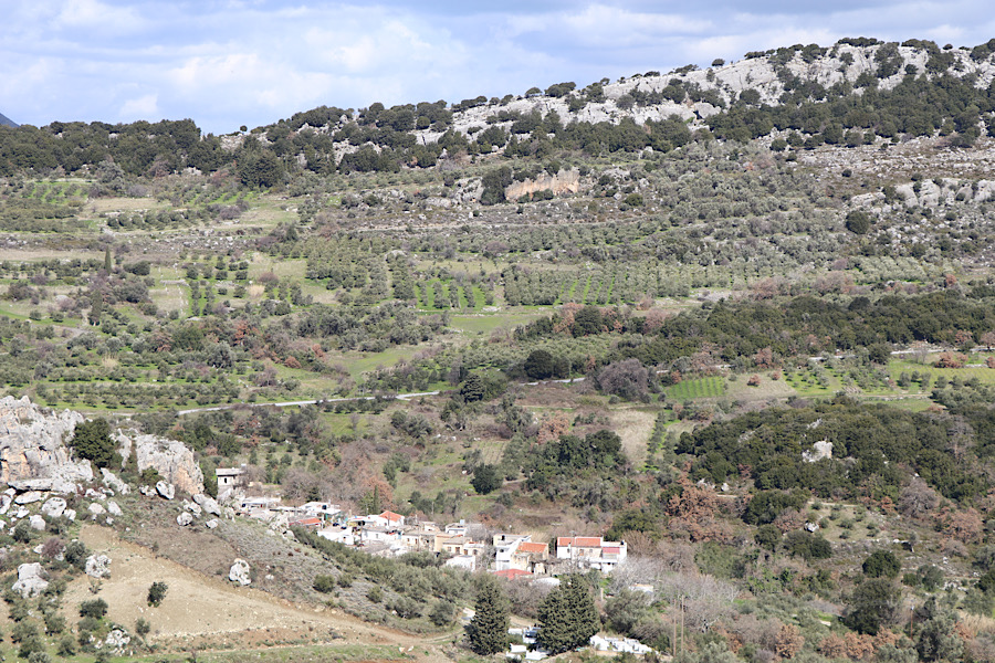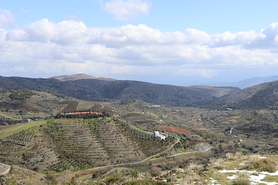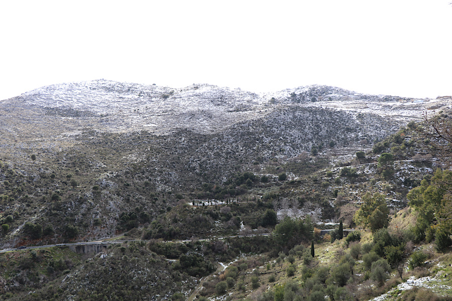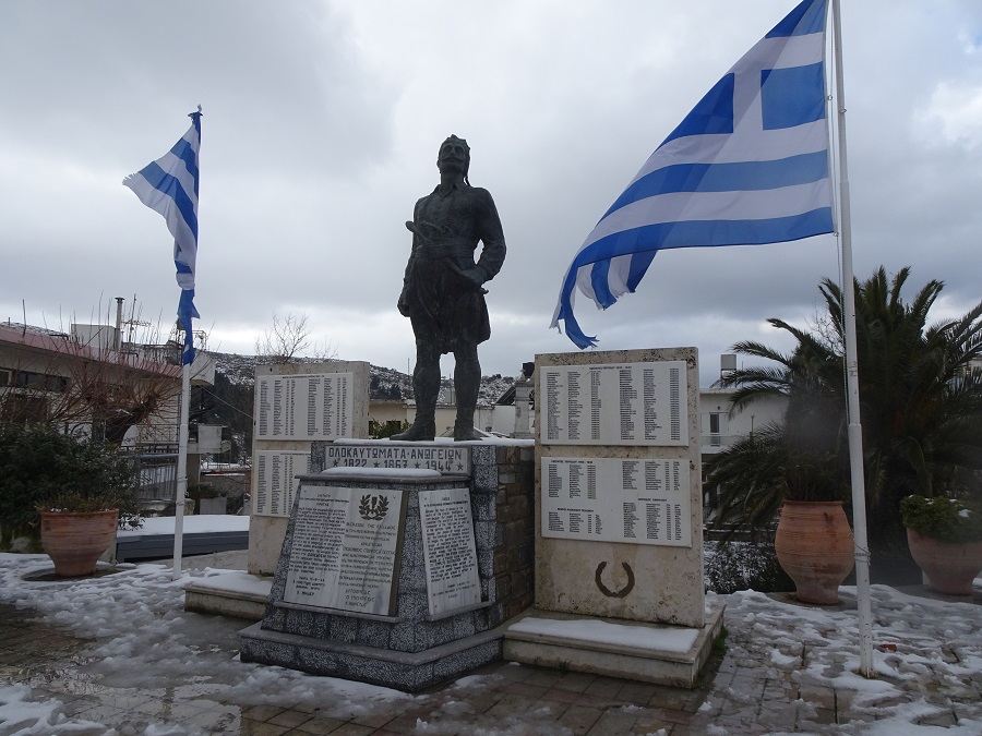 Wir erreichten Anogia, dass größte Bergdorf Kretas mit ca. 2400 Einwohnern. Es liegt mit Unter- und Oberdorf zwischen 750 und 800 Meter Höhe auf einem Bergkamm am nördlichen Fuße des Ida-Gebirgsmassivs. Hier muss es in den letzten Tagen kräftig geschneit haben, denn die Schneeräumung war voll im Gange. In einem kleinen Supermarkt bekommen wir von der Besitzerin den Tipp zum Standort der Gedenkstätte.