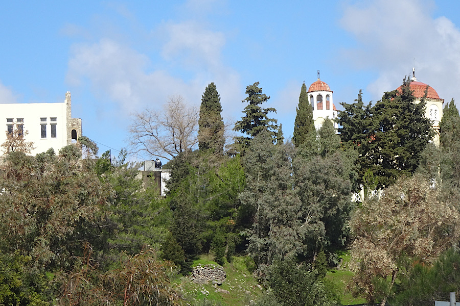 Auf der Suche nach der zweiten Gedenkstätte müssen wir uns in den engen Gassen einparken. Wir finden einen kleinen, freien Platz, wo sogar ein Souvenirladen offen hatte. Allerdings standen wir ziemlich nah bei einer Hauseinfahrt. Eine ältere Frau kam mit schönen Stickereien aus dem Haus. Brigitte kaufte ein kleines Exemplar und wir bekamen dafür wieder Teigtaschen mit Feta gefüllt – eine Spezialität des Hauses.