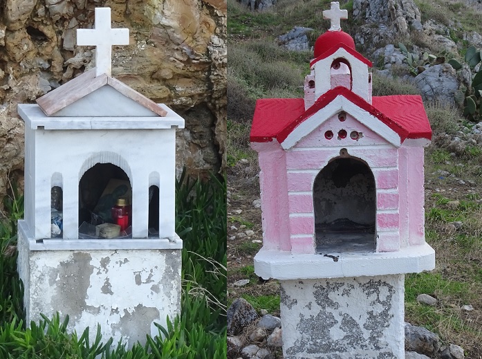 Am Weg zum Cache befindet sich ein kleiner Erinnerungsschrein. Wir finden diese Schreine überall auf Kreta entlang der Straßen. Sie sollen an lieben Menschen erinnern, der bei einem Verkehrsunfall oder einem anderen Zwischenfall ums Leben gekommen sind. GC5X71N – Fortezza Sunset von vidake.