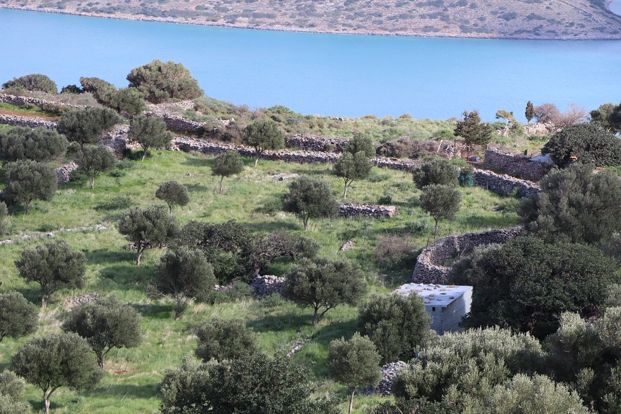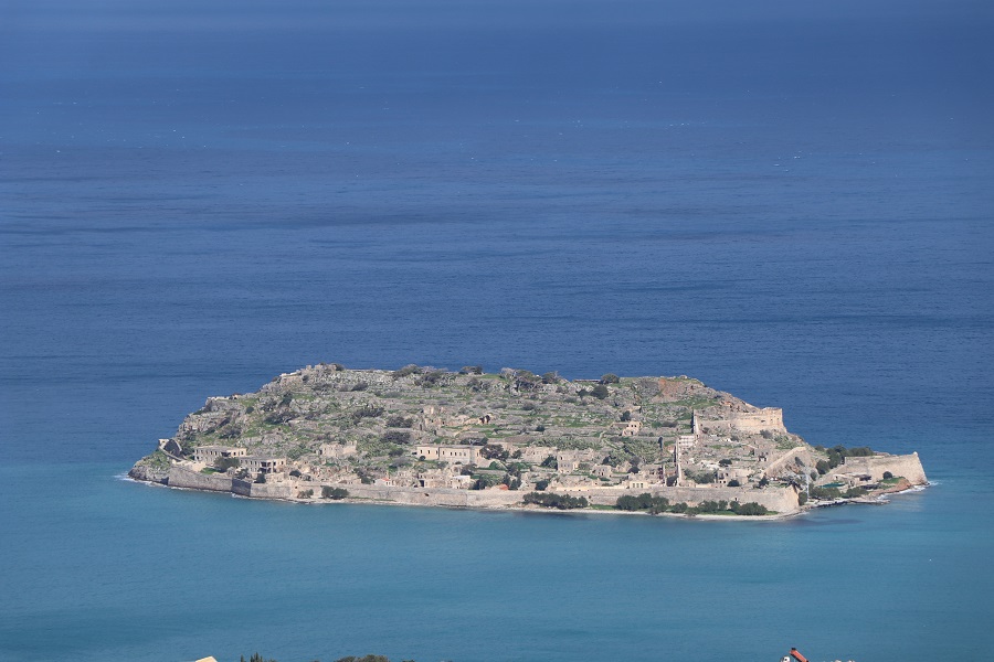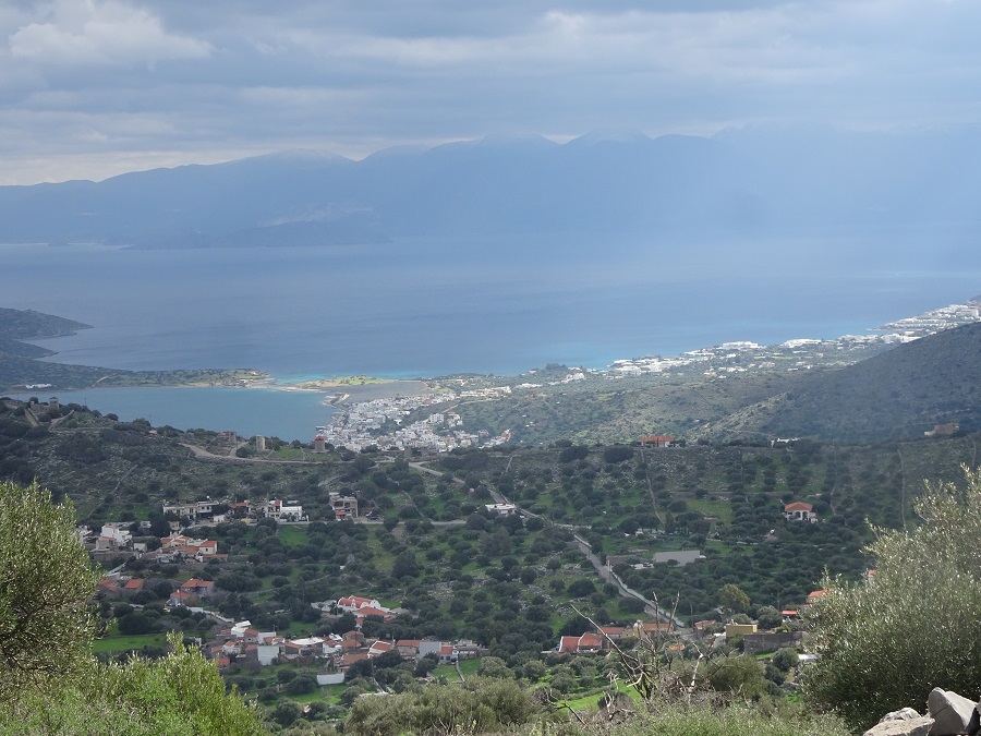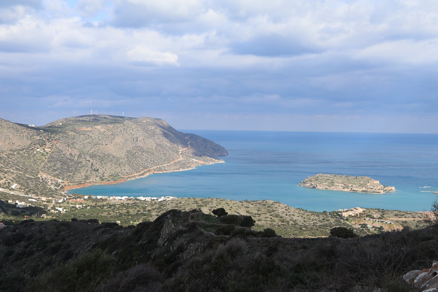 Nach zwei Stunden erreichen wir eine Biegung, wo sich uns die Bucht mit der Halbinsel Spinalonga in der Mirabello Bucht und die Leprainsel im blitzenden Blau präsentiert.
