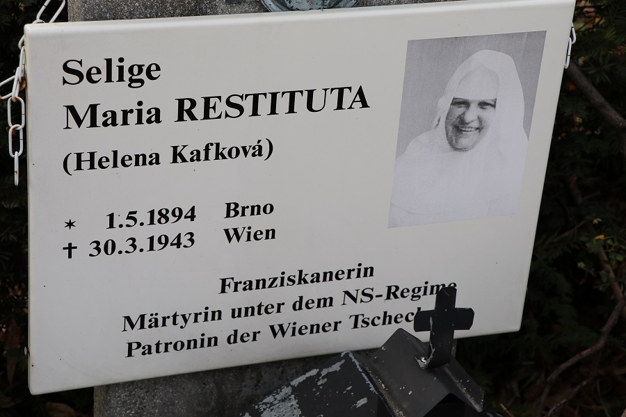 Helena Kafkova als Schwester Restituta wurde 1943 von der Gestapo in den Abendstunden geköpft. Der anwesende Priester vermerkte handschriftlich „Hetzgedicht“. Ihre Gedenktafel befindet sich im Katholisch Tschechischen Gemeindefriedhof.