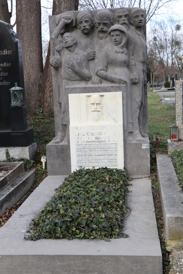Das Grab von Josef und Karoline Scheu – 1878 gründete Josef Scheu den Arbeiter-Sängerbund Wien und wurde zugleich dessen Leiter. 1890 war er Mitbegründer und Chorleiter der „Freien Typographie“. Da er auch Frauen die Mitwirkung ermöglichte, schuf er damit den ersten gemischten ArbeiterInnenchor. Scheu war neben seiner musikalischen Tätigkeit auch auf gewerkschaftlicher Ebene tätig. Allerdings wurde er dafür und wegen seiner übrigen gewerkschaftlichen und politischen Tätigkeiten vom Burgtheater 1881 zwangspensioniert und von der Polizei verhaftet.