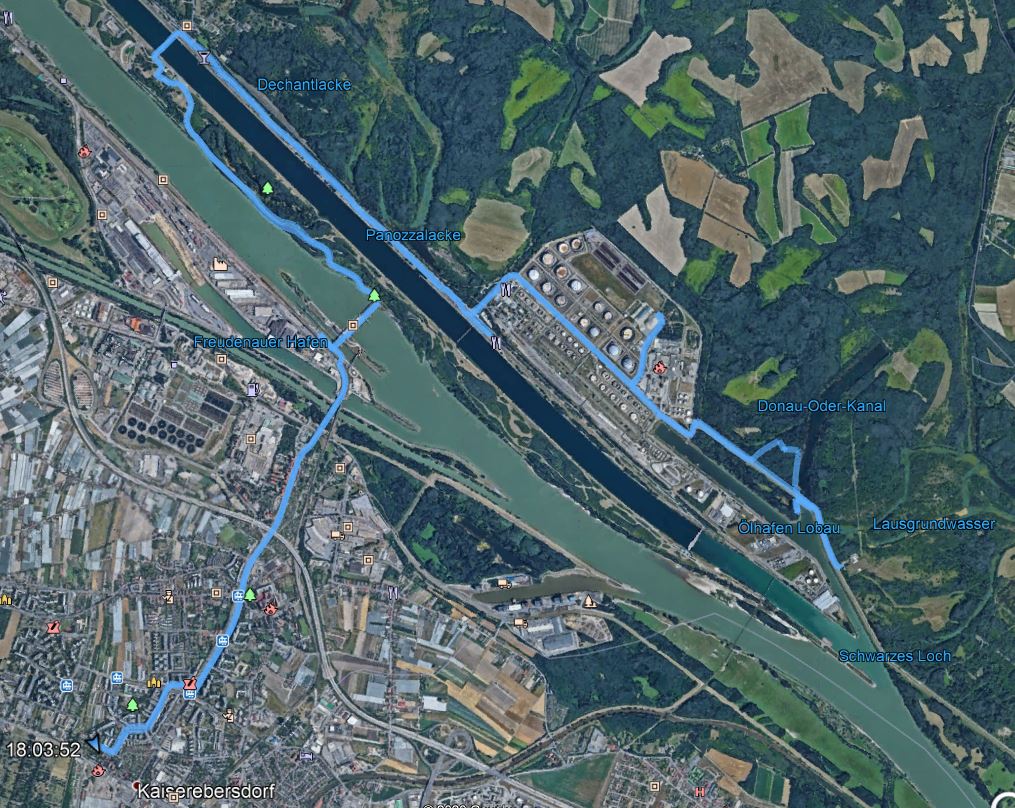 Nach einem gemütlichen Brunch und Zeitunglesen starteten wir unsere Geocaching-Radtour heute um 14:00 mit Autkar. Am Radweg entlang der Etrichstrasse und Zinnergasse überquerten wir die Donau am Radweg über das Kraftwerk Freudenau. Die Donauinsel westwärts und auf der Steinspornbrücke überquerten wir die Neue Donau mit grandiosen Ausblick.