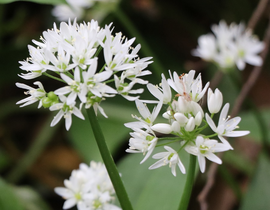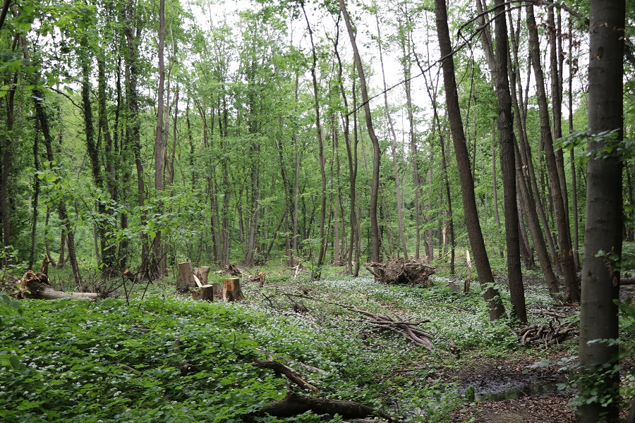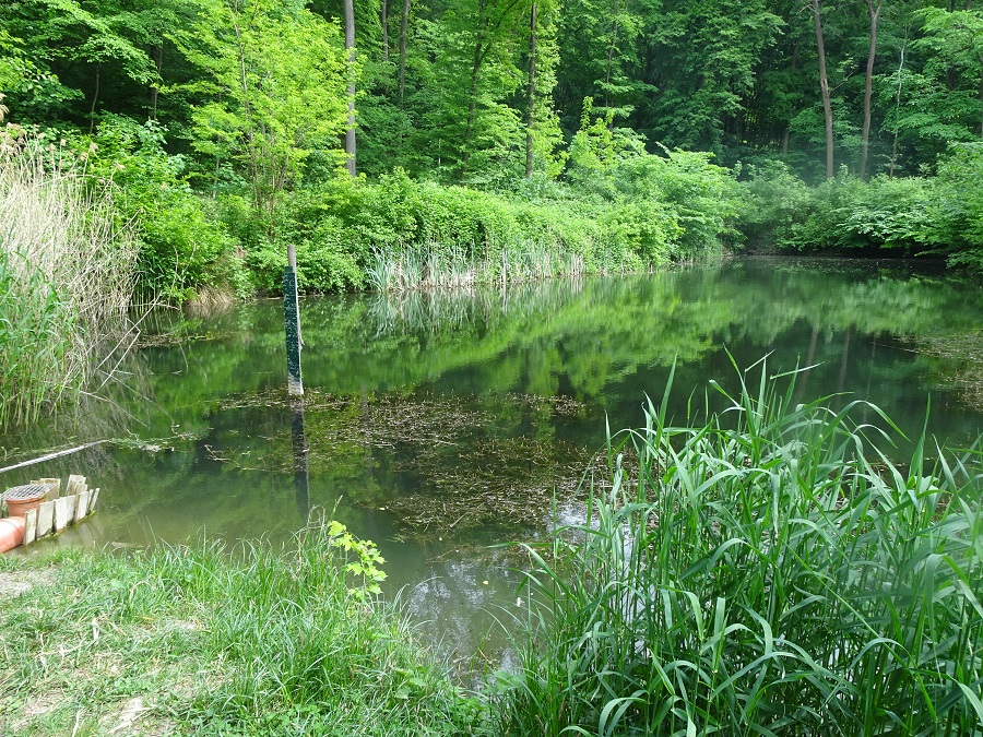 Hier am „Unteren Fischteich – GC8648A von olgueni + mia_2017“ riecht es intensiv nach Knoblauch von den weißen Bärlauchblüten. Beim Anmarsch überqueren den Arbach auf zwei Baumstämmen, wobei Donna Makrella ganz „unromantisch“ das Bacherl ohne Balanceakt überquert. Hier nehmen wir einen Gästetausch vor und loggen um 13:55.