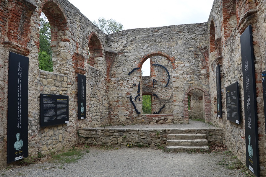 Bevor wir zum nächsten Cache abbiegen statten wir wir der ehemaligen Toranlage mit der Leopoldskapelle einen Besuch ab. Hier sind Schautafeln mit Informationen zur geschichtlichen Entwicklung von Mannersdorf und Umgebung angebracht.