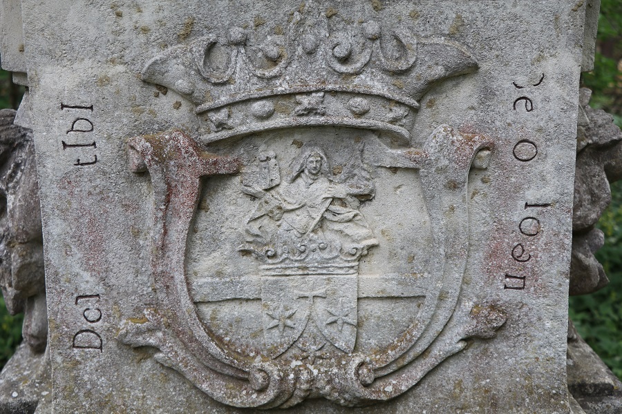 Bevor wir den „begehbaren Baum – GC864DN“ erreichen, sehen wir dieses Wappen im Sockel einer Statue. Außerdem posieren auf den Sockel für Prinzen und Prinzessinnen. In der Allee zum Kloster St. Anna erwischten wir einen günstigen Zeitpunkt ohne Muggels beim Baum.