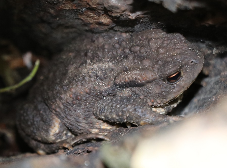 Wir haben auch den geheimen Wächter der Klause entdeckt. Ihre warzige, drüsenreiche Haut mit den kurzen Hinterbeinen und ihr direkter Blick lassen selbst den erfahrensten Geocacher kurz erstarren. Dann das Duell – starrer Blick gegen starren Blick. Wir hatten Glück – diese Kröte bewachte ausnahmsweise nicht den Cache.