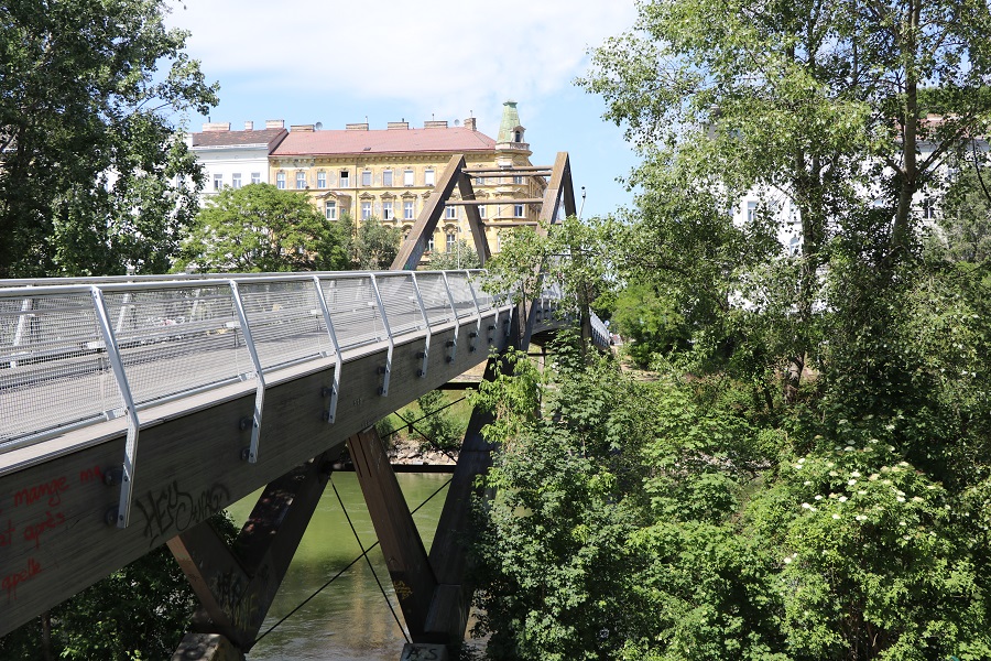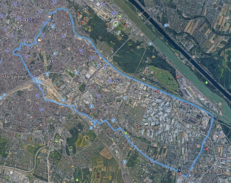 Heimwärts gings entlang des Donaukanals. Donna Makrellas Cacheesel lahmte etwas und alle paar Kilometer brauchte der „Vorderfuß“ eine Portion Luft, um den Packsattel voller Mehl nach Hause galopppieren zu können. Am Weg nahmen wir noch Kreuzung ohne Autos – GC7WN0F von cley420 mit.